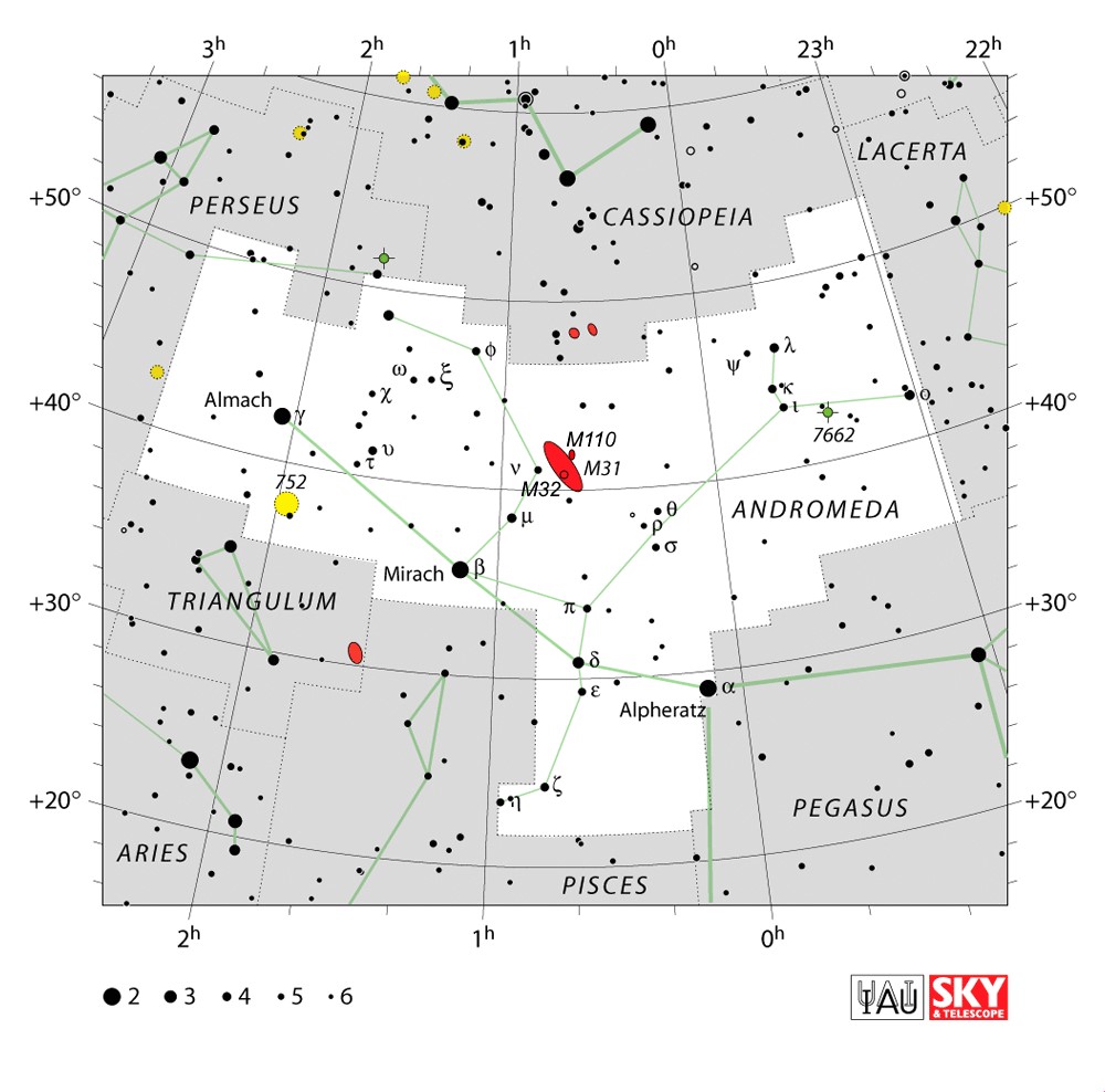 Andromeda is most prominent during autumn evenings in the Northern Hemisphere, along with several other constellations named for characters in the Perseus myth. Because of its northern declination, Andromeda is visible only north of 40° south latitude; for observers farther south, it lies below the horizon. It is one of the largest constellations, with an area of 722 square degrees. This is over 1,400 times the size of the full moon, 55% of the size of the largest constellation, Hydra, and over 10 times the size of the smallest constellation, Crux. |  |