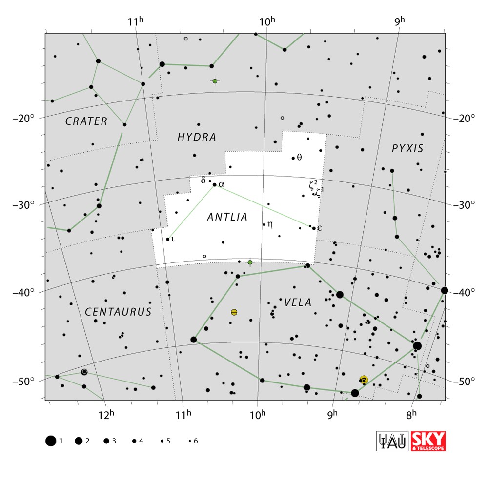 Antlia  Visible from latitudes 45° to -90° Optimum visibility January to April Celestial Quadrant  SQ2 | [Ant] | Antlia is a constellation in the Southern Celestial Hemisphere. Its name means "pump" in Latin and Greek; it represents an air pump. Originally Antlia Pneumatica, the constellation was established by Nicolas-Louis de Lacaille in the 18th century. Its non-specific (single-word) name, already in limited use, was preferred by John Herschel then welcomed by the astronomic community which officially accepted this. North of stars forming some of the sails of the ship Argo Navis, Antlia is completely visible from latitudes south of 49 degrees north. |  |