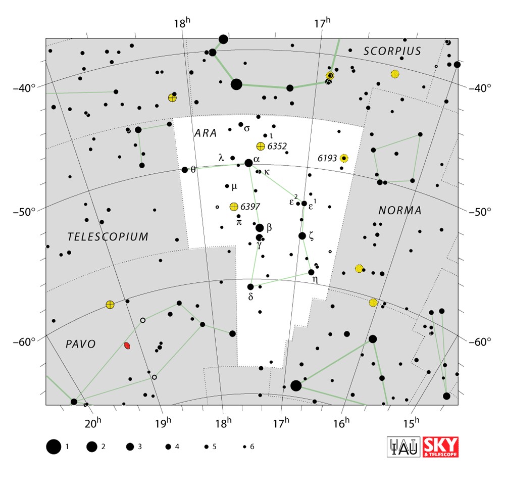 Ara  Visible from latitudes 25° to -90° Optimum visibility April to July Celestial Quadrant  SQ3 | [Ara] | Ara is a southern constellation between Scorpius, Telescopium, Triangulum Australe, and Norma. It was one of the Greek bulk described by the 2nd-century astronomer Ptolemy, and it remains one of the 88 modern constellations designated by the International Astronomical Union. |  |