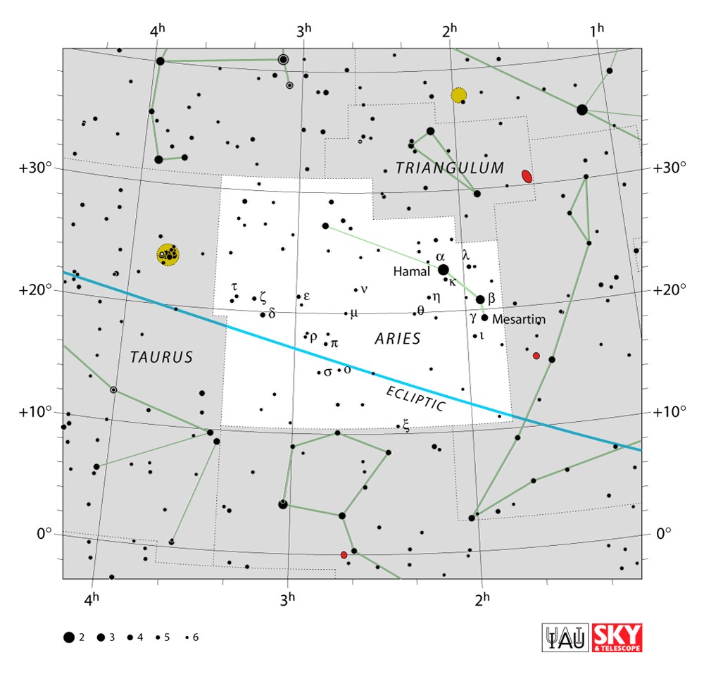 Aries  Visible from latitudes 90° to -60° Optimum visibility October to January Celestial Quadrant  NQ1 | [Ari] | Aries is one of the constellations of the zodiac. It is located in the Northern celestial hemisphere between Pisces to the west and Taurus to the east. The name Aries is Latin for ram. It is one of the 48 constellations described by the 2nd century astronomer Ptolemy, and remains one of the 88 modern constellations. It is a mid-sized constellation, ranking 39th overall size, with an area of 441 square degrees. |  |