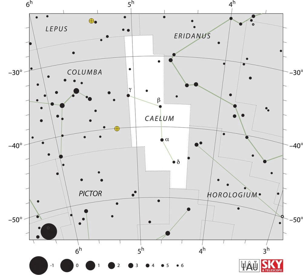 Caelum  Visible from latitudes 40° to -90° Optimum visibility October to January Celestial Quadrant  SQ1 | [Cae] | Caelum is a faint constellation in the southern sky, introduced in the 1750s by Nicolas Louis de Lacaille and counted among the 88 modern constellations. Its name means "chisel" in Latin, and it was formerly known as Caelum Sculptorium ; It is a rare word, unrelated to the far more common Latin caelum, meaning "sky, heaven, atmosphere". It is the eighth-smallest constellation, and subtends a solid angle of around 0.038 steradians, just less than that of Corona Australis. |  |