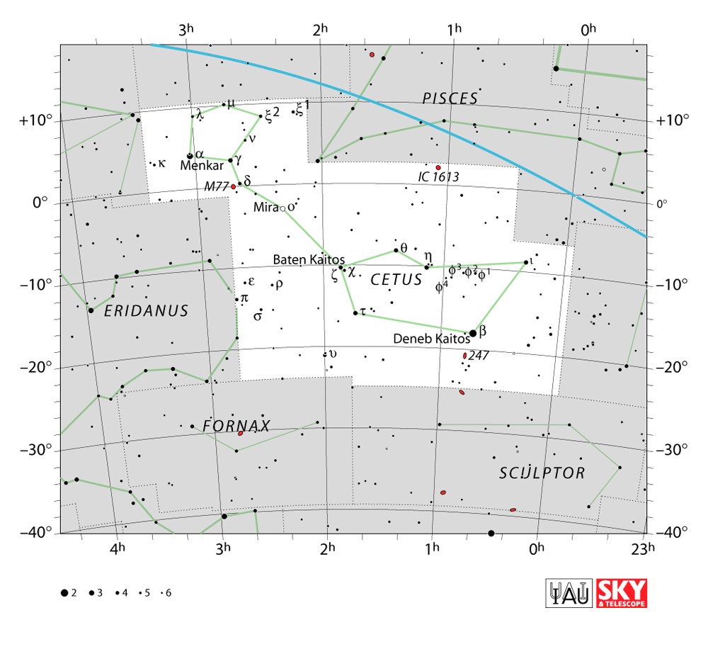 Cetus  Visible from latitudes 70° to -90° Optimum visibility October to January Celestial Quadrant  SQ1 | [Cet] | Cetus is a constellation, sometimes called 'the whale' in English. The Cetus was a sea monster in Greek mythology which both Perseus and Heracles needed to slay. Cetus is in the region of the sky that contains other water-related constellations: Aquarius, Pisces and Eridanus. |  |