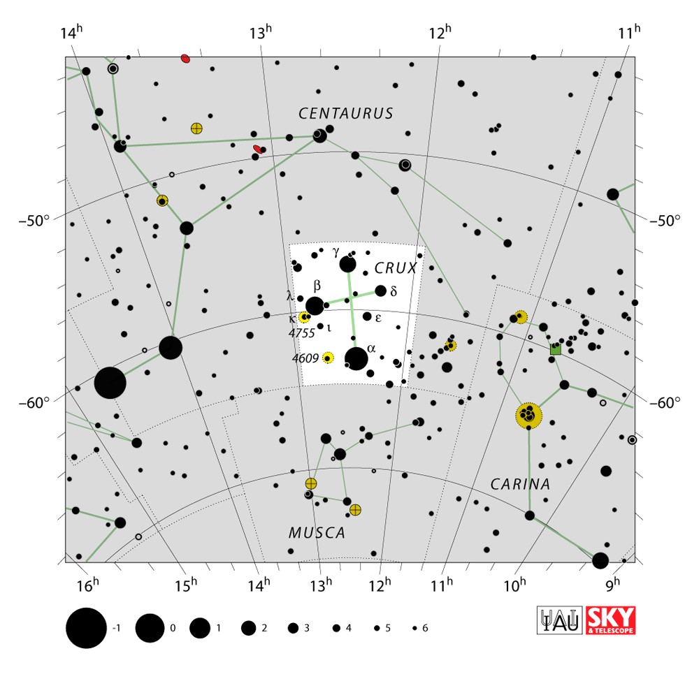 Crux  Visible from latitudes 20° to -90° Optimum visibility April to July Celestial Quadrant  SQ3 | [Cru] | Crux is a constellation of the southern sky that is centred on four bright stars in a cross-shaped asterism commonly known as the Southern Cross. It lies on the southern end of the Milky Way's visible band. The name Crux is Latin for cross. Even though it is the smallest of all 88 modern constellations, Crux is among the most easily distinguished as its four main stars each have an apparent visual magnitude brighter than +2.8. It has attained a high level of cultural significance in many Southern Hemisphere states and nations. |  |