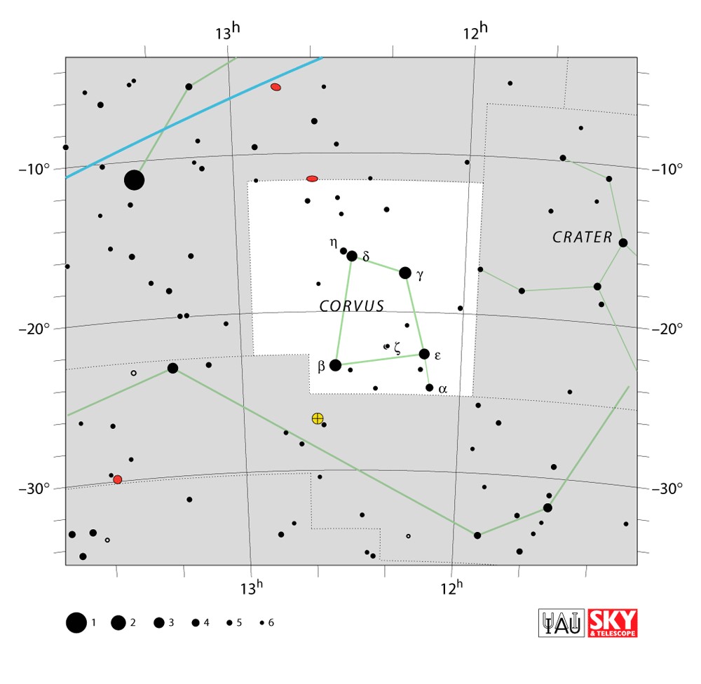 Corvus  Visible from latitudes 60° to -90° Optimum visibility April to July Celestial Quadrant  SQ3 | [Crv] | Corvus is a small constellation in the Southern Celestial Hemisphere. Its name means "crow" in Latin. One of the 48 constellations listed by the 2nd-century astronomer Ptolemy, it depicts a raven, a bird associated with stories about the god Apollo, perched on the back of Hydra the water snake. The four brightest stars, Gamma, Delta, Epsilon, and Beta Corvi, form a distinctive quadrilateral in the night sky. |  |