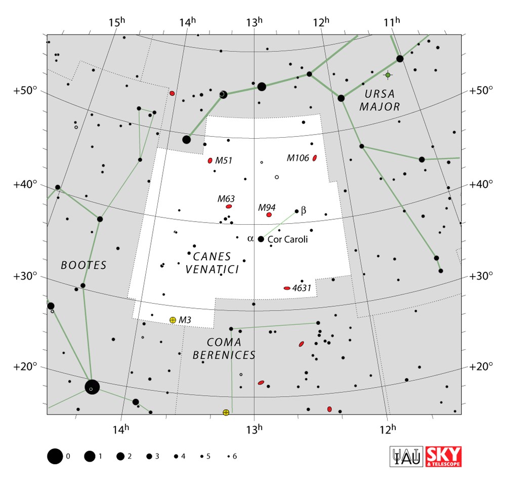 Canes Venatici  Visible from latitudes 90° to -40° Optimum visibility April to July Celestial Quadrant  NQ3 | [CVn] | Canes Venatici is one of the 88 constellations designated by the International Astronomical Union (IAU). It is a small northern constellation that was created by Johannes Hevelius in the 17th century. Its name is Latin for 'hunting dogs', and the constellation is often depicted in illustrations as representing the dogs of Bootes the Herdsman, a neighboring constellation. |  |
