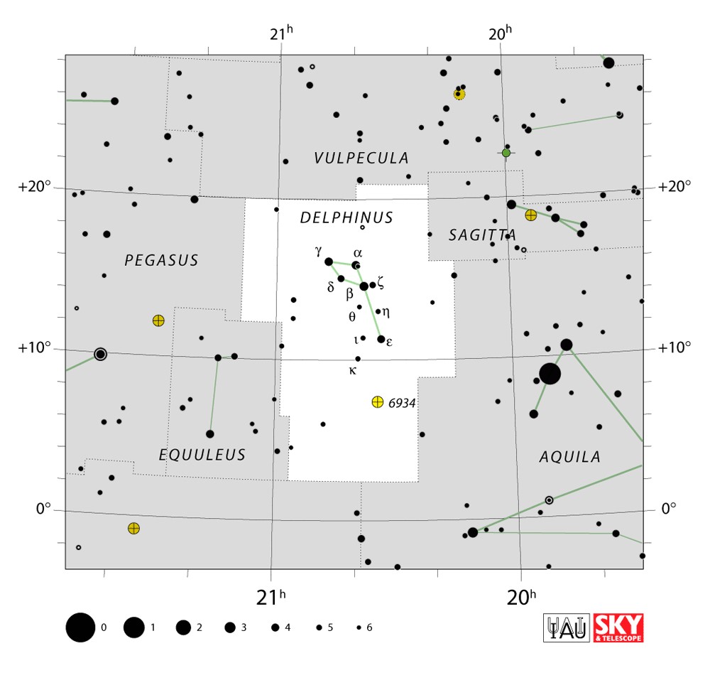 Delphinus  Visible from latitudes 90° to -70° Optimum visibility July to October Celestial Quadrant  NQ4 | [Del] | Delphinus is a small constellation in the Northern Celestial Hemisphere, close to the celestial equator. Its name is the Latin version for the Greek word for dolphin. It is one of the 48 constellations listed by the 2nd century astronomer Ptolemy, and remains one of the 88 modern constellations recognized by the International Astronomical Union. It is one of the smaller constellations, ranked 69th in size. Delphinus' five brightest stars form a distinctive asterism symbolizing a dolphin with four stars representing the body and one the tail. It is bordered by Vulpecula, Sagitta, Aquila, Aquarius, Equuleus and Pegasus. |  |