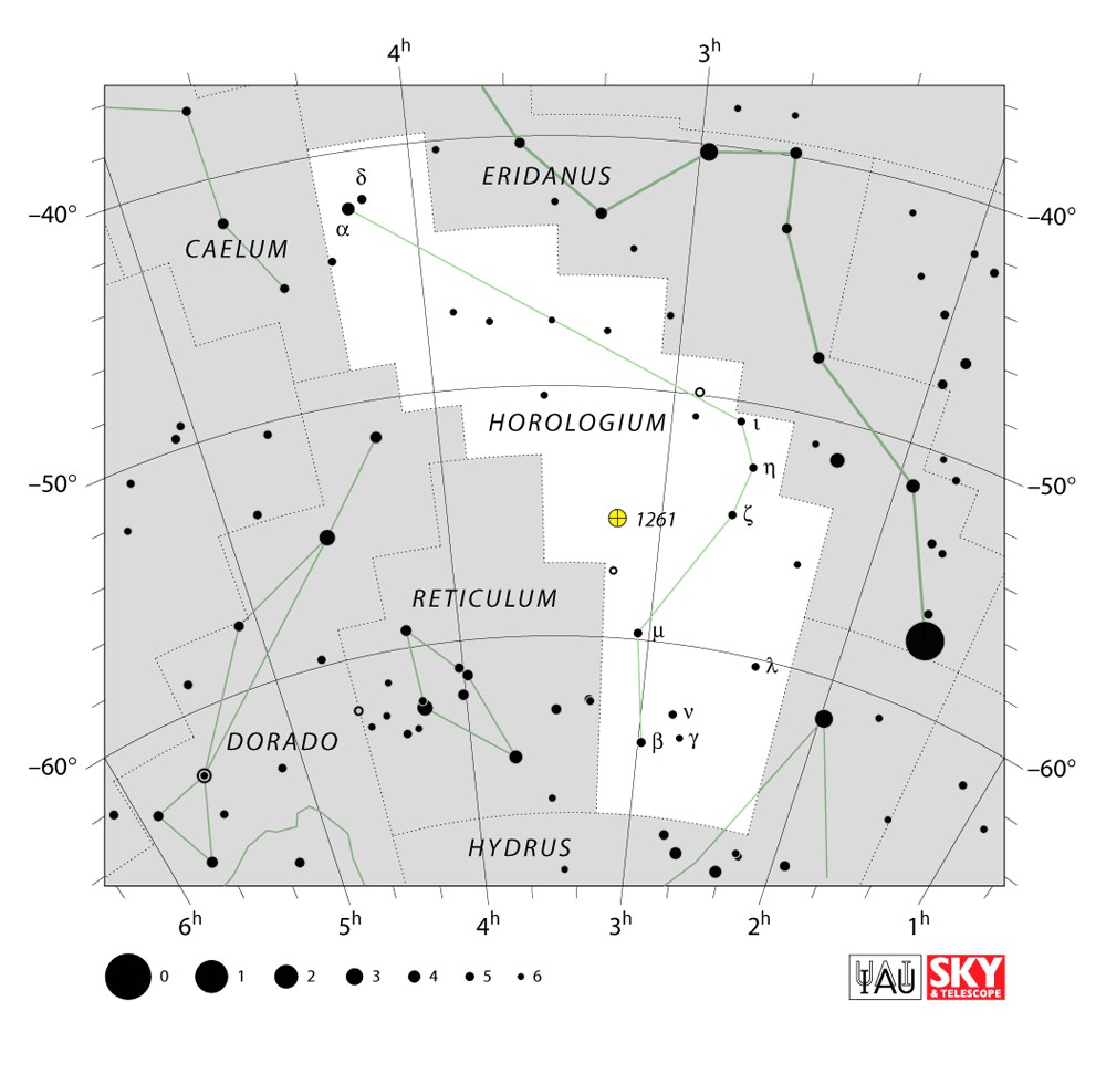 Horologium  Visible from latitudes 20° to -90° Optimum visibility October to January Celestial Quadrant  SQ1 | [Hor] | Horologium is a constellation of six stars faintly visible in the southern celestial hemisphere. It was first described by the French astronomer Nicolas-Louis de Lacaille in 1756 and visualized by him as a clock with a pendulum and a second hand. In 1922 the constellation was redefined by the International Astronomical Union (IAU) as a region of the celestial sphere containing Lacaille's stars, and has since been an IAU designated constellation. Horologium's associated region is wholly visible to observers south of 23°N. |  |