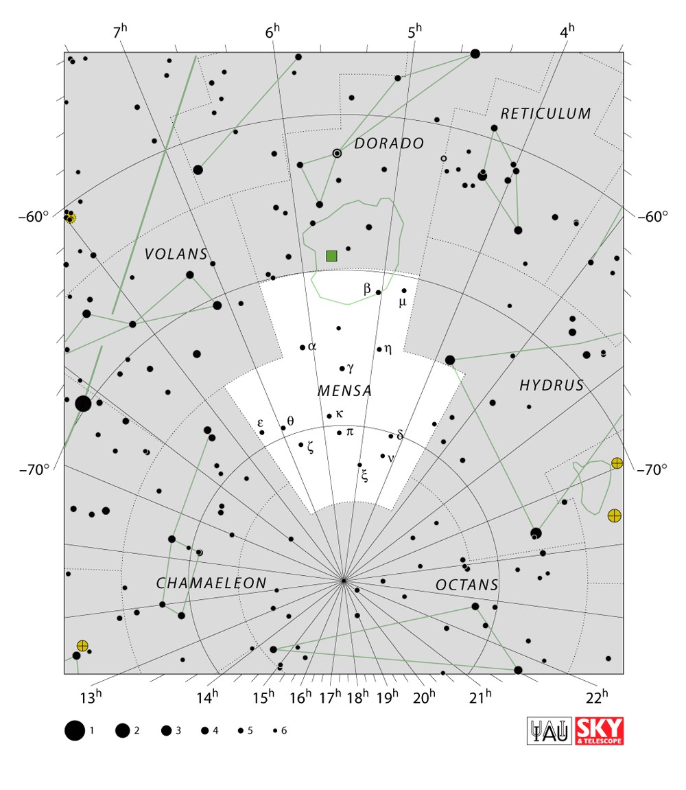 Mensa  Visible from latitudes 0° to -90° Optimum visibility October to January Celestial Quadrant  SQ1 | [Men] | Mensa is a constellation in the Southern Celestial Hemisphere near the south celestial pole, one of fourteen constellations drawn up in the 18thcentury by French astronomer Nicolas-Louis de Lacaille. Its name is Latin for table, though it originally commemorated Table Mountain and was known as "Mons Mensae". One of the eighty-eight constellations designated by the International Astronomical Union (IAU), it covers a keystone-shaped wedge of sky 153.5 square degrees in area. Other than the south polar constellation of Octans, it is the most southerly of constellations and is observable only south of the 5th parallel of the Northern Hemisphere. |  |