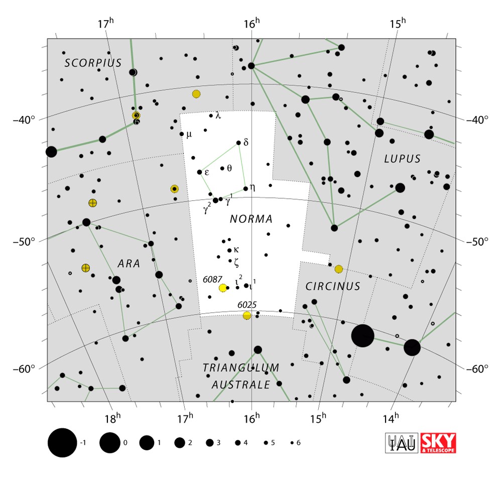 Norma  Visible from latitudes 30° to -90° Optimum visibility April to July Celestial Quadrant  SQ3 | [Nor] | Norma is a small constellation in the Southern Celestial Hemisphere between Ara and Lupus, one of twelve drawn up in the 18thcentury by French astronomer Nicolas-Louis de Lacaille and one of several depicting scientific instruments. Its name is Latin for normal, referring to a right angle, and is variously considered to represent a rule, a carpenter's square, a set square or a level. It remains one of the 88 modern constellations. |  |