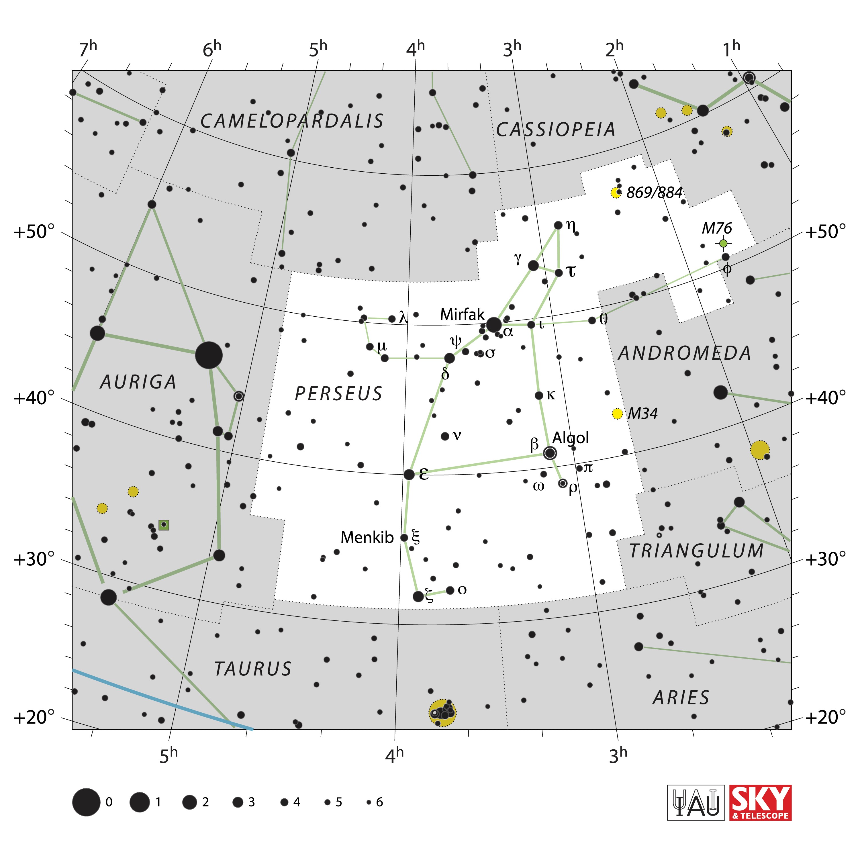 Perseus  Visible from latitudes 90° to -35° Optimum visibility October to January Celestial Quadrant  NQ1 | [Per] | Perseus is a constellation in the northern sky, being named after the Greek mythological hero Perseus. It is one of the 48 ancient constellations listed by the 2nd-century astronomer Ptolemy, and among the 88 modern constellations defined by the International Astronomical Union (IAU). It is located near several other constellations named after ancient Greek legends surrounding Perseus, including Andromeda to the west and Cassiopeia to the north. Perseus is also bordered by Aries and Taurus to the south, Auriga to the east, Camelopardalis to the north, and Triangulum to the west. Some star atlases during the early 19th century also depicted Perseus holding the disembodied head of Medusa, whose asterism was named together as Perseus et Caput Medusae; however, this never came into popular usage. |  |