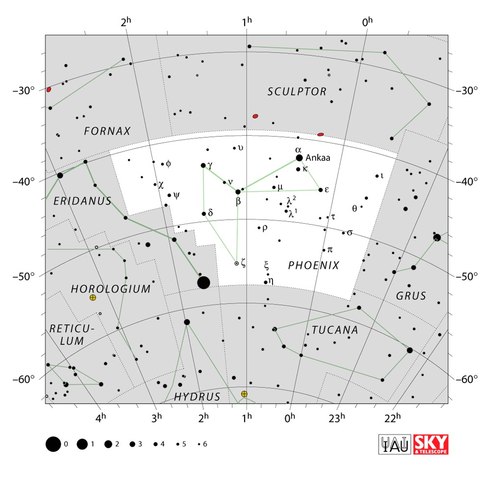 Phoenix  Visible from latitudes 30° to -90° Optimum visibility October to January Celestial Quadrant  SQ1 | [Phe] | Phoenix is a minor constellation in the southern sky. Named after the mythical phoenix, it was first depicted on a celestial atlas by Johann Bayer in his 1603 Uranometria. The French explorer and astronomer Nicolas Louis de Lacaille charted the brighter stars and gave their Bayer designations in 1756. The constellation stretches from roughly -39° to -57° declination, and from 23.5h to 2.5h of right ascension. The constellations Phoenix, Grus, Pavo and Tucana, are known as the Southern Birds. |  |