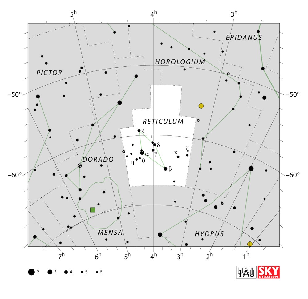 Reticulum  Visible from latitudes 20° to -90° Optimum visibility October to January Celestial Quadrant  SQ1 | [Ret] | Reticulum is a small, faint constellation in the southern sky. Its name is Latin for a small net, or reticle-a net of crosshairs at the focus of a telescope eyepiece that is used to measure star positions. The constellation is best viewed between October and December, and save for one main star visible in ideal conditions, cannot be seen from north of the 30th parallel north. |  |