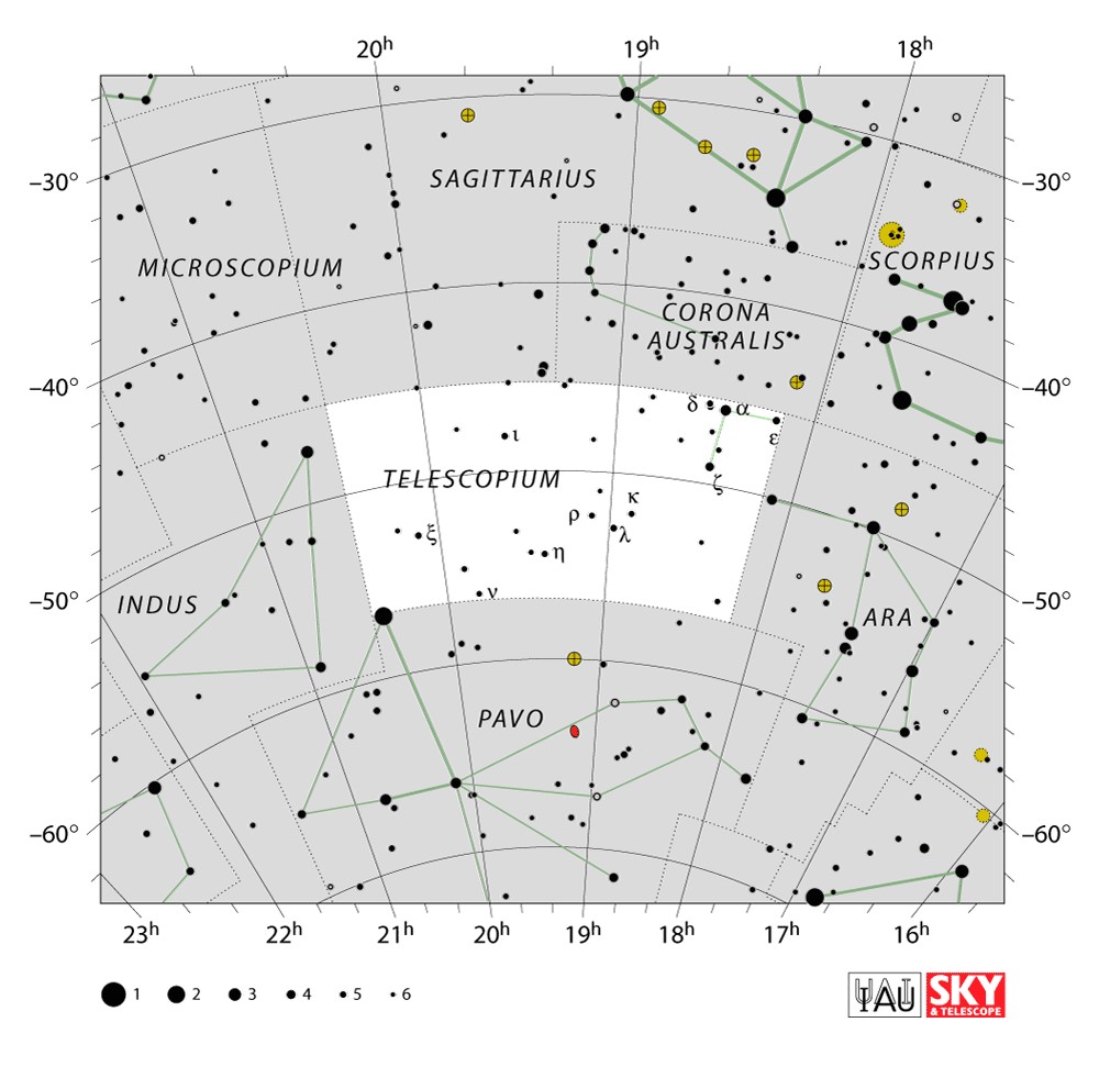 Telescopium  Visible from latitudes 30° to -90° Optimum visibility July to October Celestial Quadrant  SQ4 | [Tel] | Telescopium is a minor constellation in the southern celestial hemisphere, one of twelve named in the 18th century by French astronomer Nicolas-Louis de Lacaille and one of several depicting scientific instruments. Its name is a Latinized form of the Greek word for telescope. Telescopium was later much reduced in size by Francis Baily and Benjamin Gould. |  |