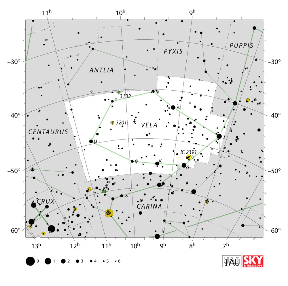 Vela  Visible from latitudes 30° to -90° Optimum visibility January to April Celestial Quadrant  SQ2 | [Vel] | Vela is a constellation in the southern sky, which contains the Vela Supercluster. Its name is Latin for the sails of a ship, and it was originally part of a larger constellation, the ship Argo Navis, which was later divided into three parts, the others being Carina and Puppis. With an apparent magnitude of 1.8, its brightest star is the hot blue multiple star Gamma Velorum, one component of which is the brightest Wolf-Rayet star in the sky. Delta and Kappa Velorum, together with Epsilon and Iota Carinae, form the asterism known as the False Cross. 1.95-magnitude Delta is actually a triple or quintuple star system. |  |